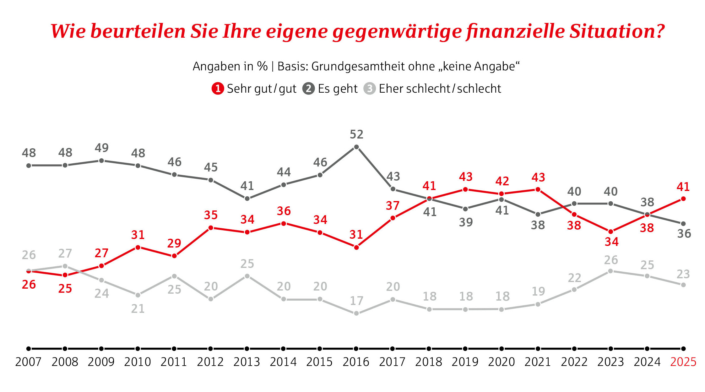 Insgesamt nähern sich die Zahlen den Ergebnissen aus den Jahren vor dem russischen Überfall auf die Ukraine an. Das zeigt sich auch daran, dass 37 Prozent der Befragten in den kommenden beiden Jahren eine Verbesserung ihrer finanziellen Situation erwarten. Vor allem die jungen Menschen sind optimistisch: Knapp drei Viertel der 16- bis 39-Jährigen rechnen sogar damit, dass sich ihre Lage in den kommenden beiden Jahren verbessern wird.