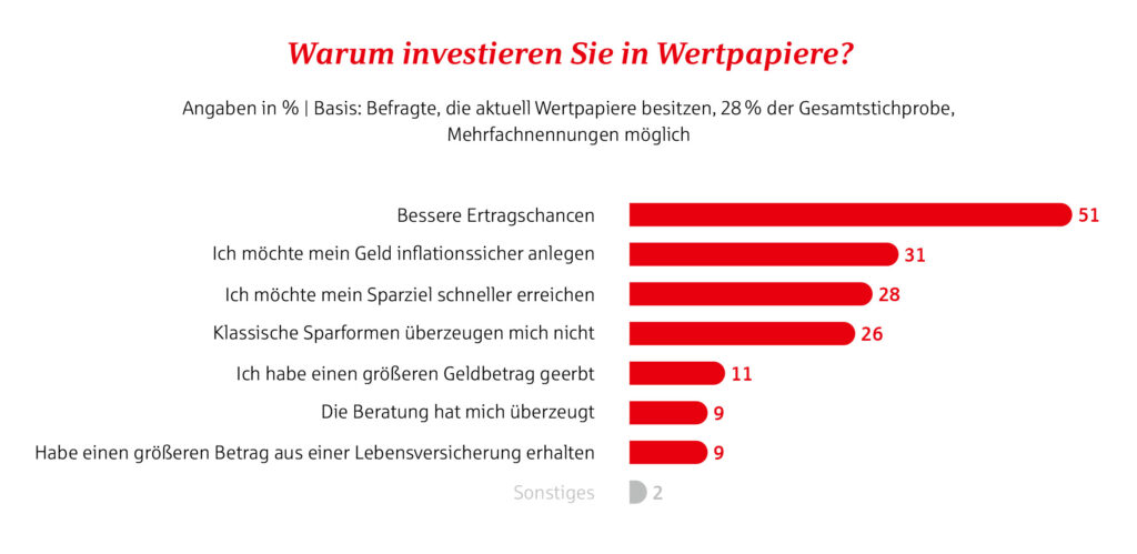 Eine weitere erfreuliche Entwicklung: 63 Prozent der Befragten haben bereits etwas für ihre finanzielle Absicherung im Alter getan oder entsprechende Pläne. Das sind 2 Prozentpunkte mehr als vergangenes Jahr. 22 Prozent der Befragten sorgen aktiv vor und wollen darüber hinaus noch mehr tun. Außerdem ist laut Vermögensbarometer der Anteil derjenigen auf 37 Prozent gesunken, die bislang noch nicht vorgesorgt haben. Und: Die Altersvorsorge treibt viele Wertpapier-Besitzende an: 44 Prozent dieser Gruppe sind überzeugt, dass sich Wertpapiere gut dafür eignen.