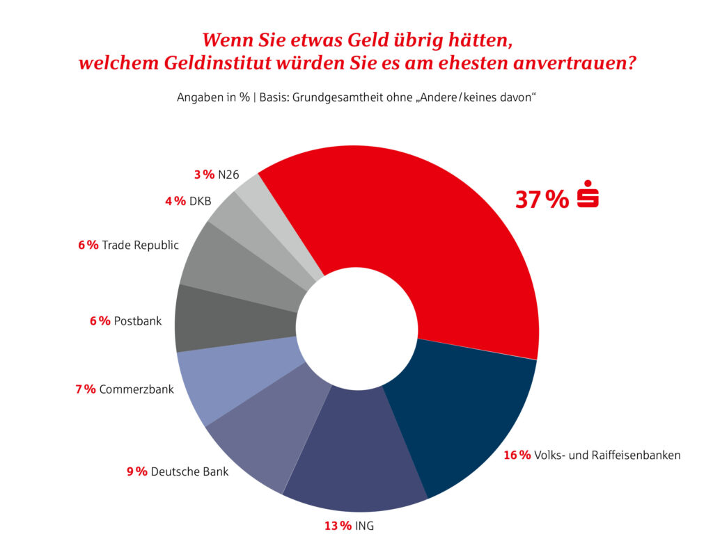 Gerade wenn es um ihre Finanzen geht, suchen die Menschen einen Partner, dem sie vertrauen können. Auch in diesem Jahr stehen die Sparkassen an erster Stelle: 37 Prozent der Befragten – und damit noch einmal mehr als in den vergangenen Jahren – würden ihr Erspartes bevorzugt zu den Sparkassen bringen. Die Volks- und Raiffeisenbanken belegen mit 16 Prozent den zweiten Platz. Unter den Direktbanken genießt die ING mit einem Anteil von 13 Prozent das höchste Ansehen.