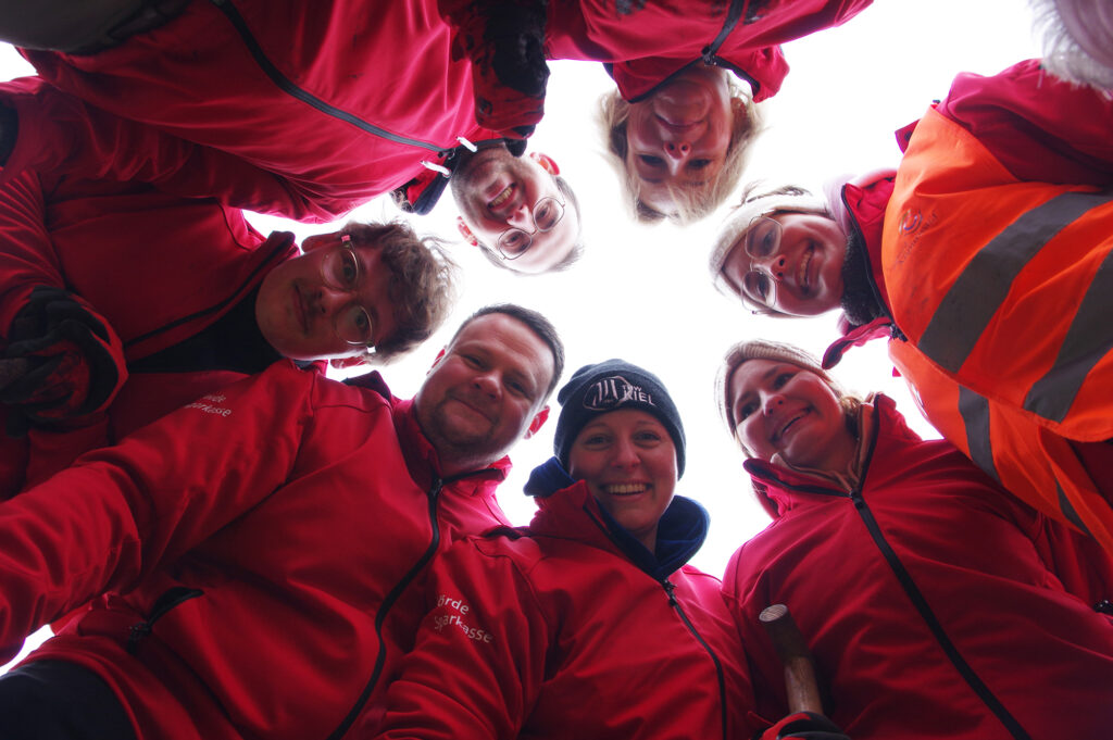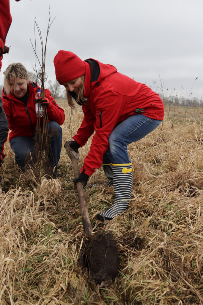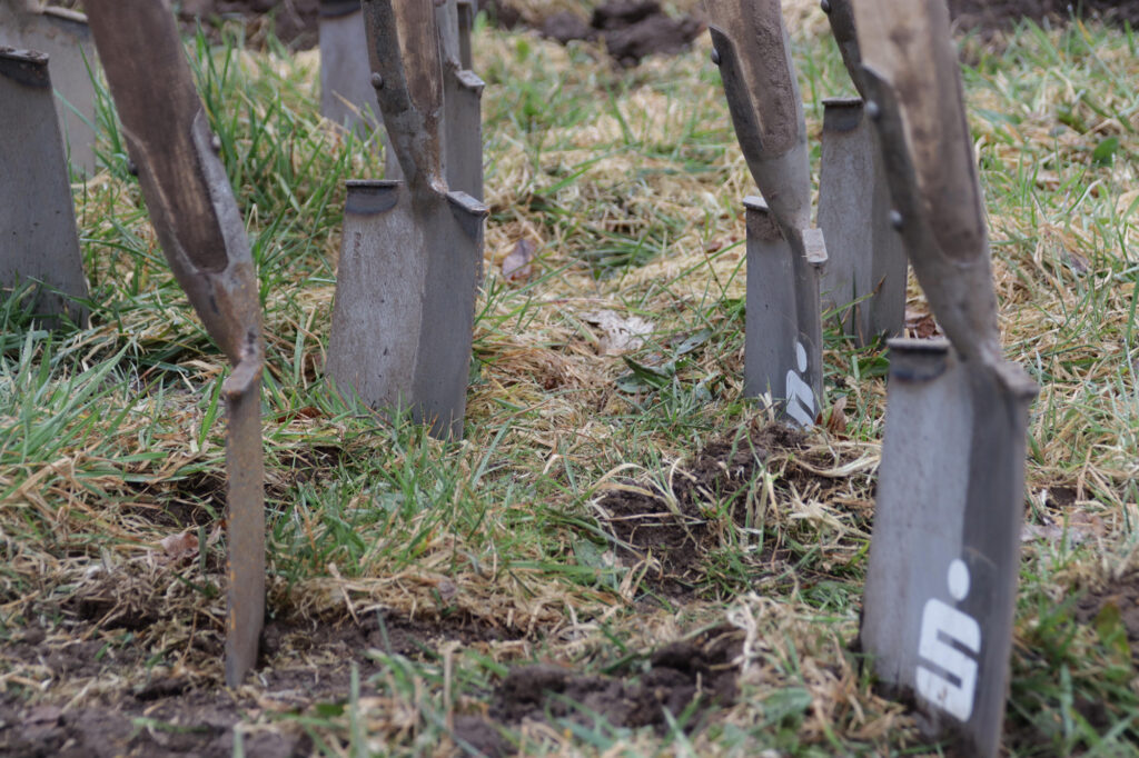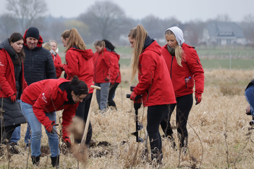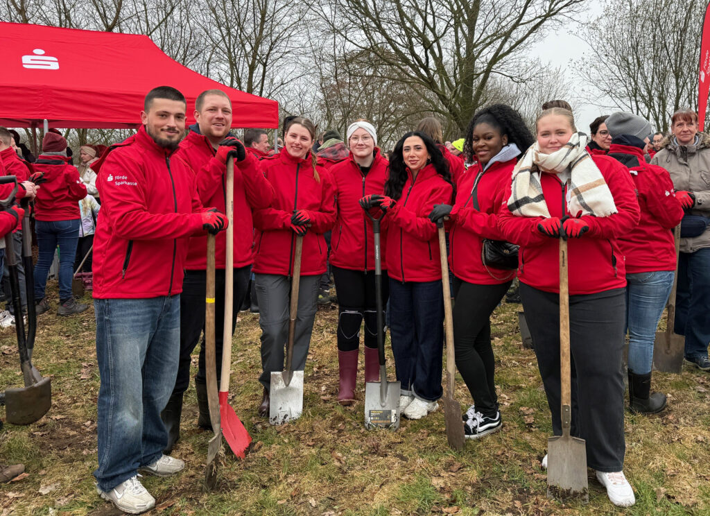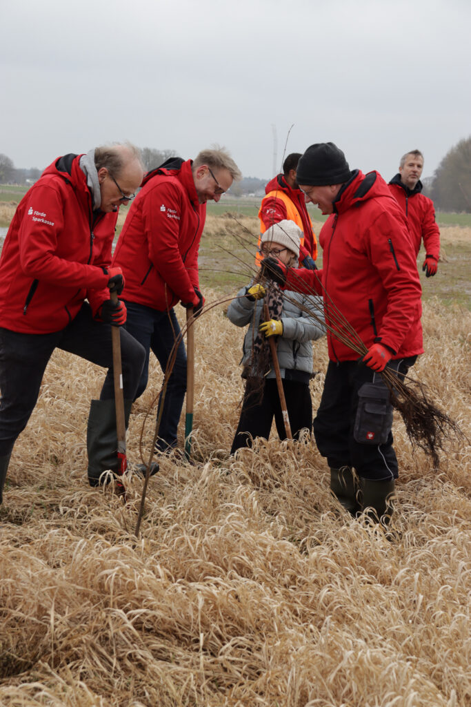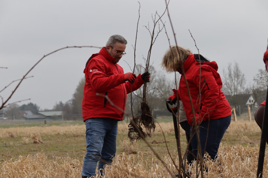 Unser Vorstandsvorsitzender Peter Moll begrüßte die Teilnehmer:innen um 10 Uhr zum Start der Aktion. Zusammen mit Vorstandsmitglied Enke Koberg packte er ebenfalls mit an und steckte Setzlinge in die Erde. Viele Kolleg:innen bildeten bereits für die Anfahrt Fahrgemeinschaften und trafen als feste Teams ein. Die Organisatoren händigten uns Jacken der Förde Sparkasse, Handschuhe sowie Spaten aus, woraufhin die Arbeit unmittelbar begann.