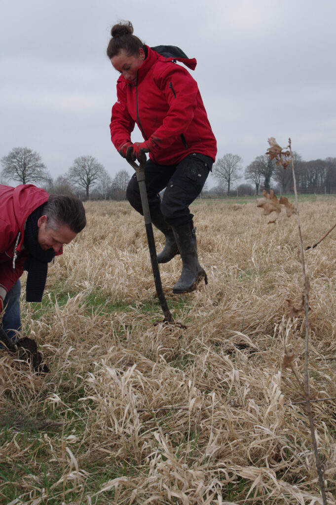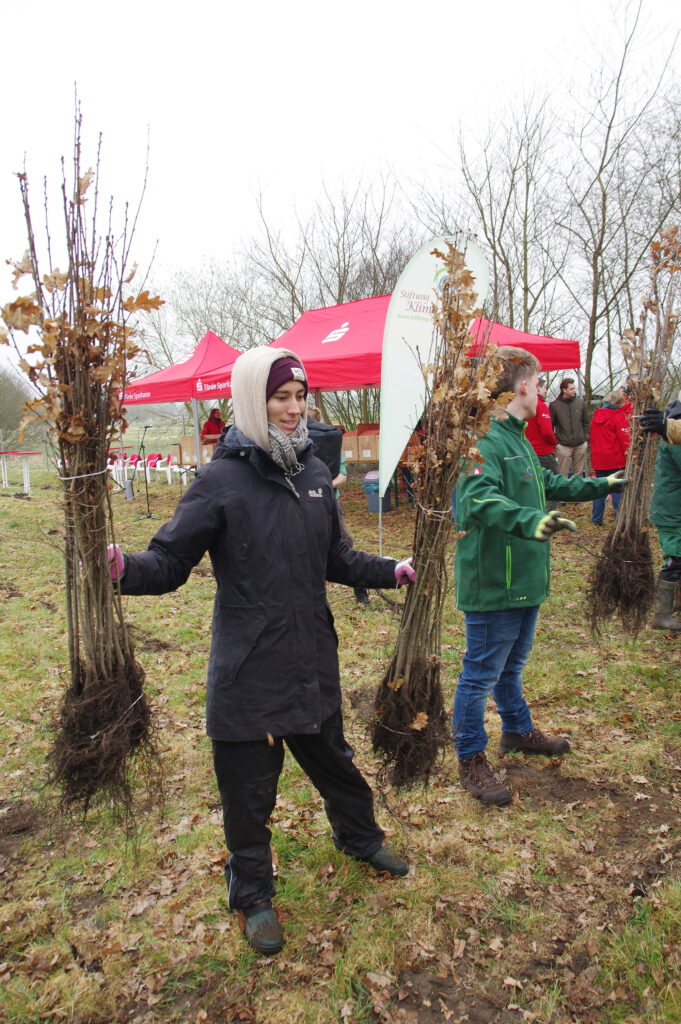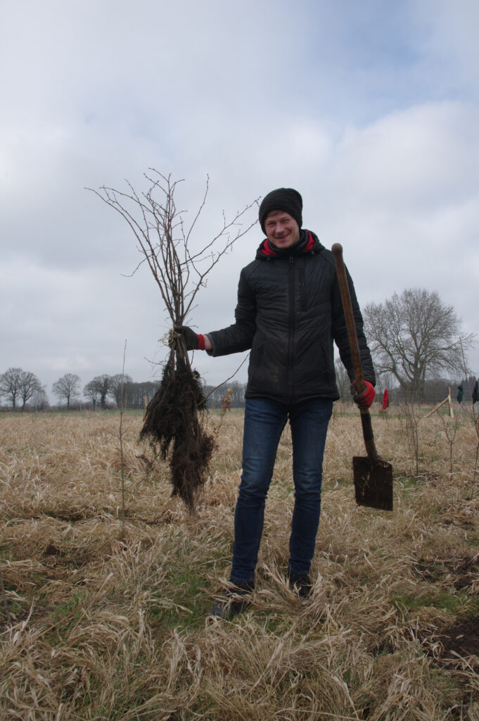 Unser Ziel war es, gemeinsam einen neuen Klimawald zu pflanzen und das in echt großem Umfang: Über 7.500 Setzlinge auf 1,8 Hektar Fläche. Gepflanzt wurden unter anderem Eiche, Hainbuchen, Winterlinden, Flatterulmen sowie Erlen und Eschen. Am Waldrand wurden blühende Sträucher wie Schlehen, schwarzer Holunder und Pfaffenhütchen gepflanzt, damit auch Insekten vom neuen Wald profitieren. Unterstützt wurden wir dabei von den Expert:innen der Stiftung Klimawald.