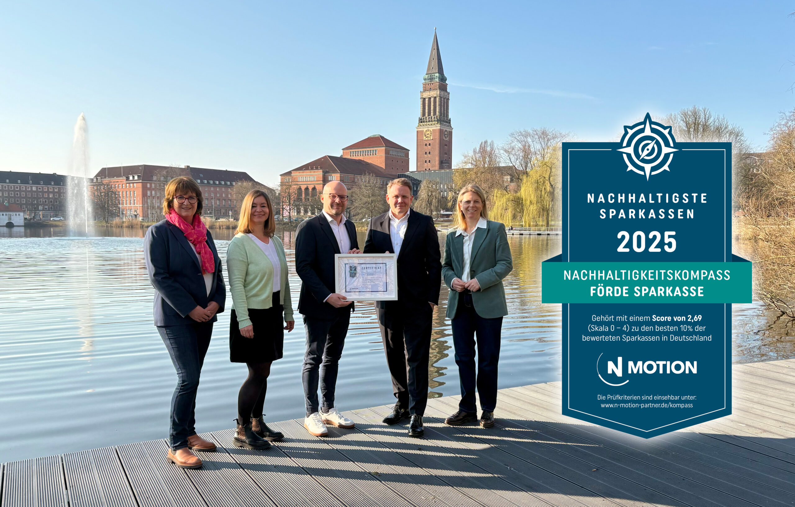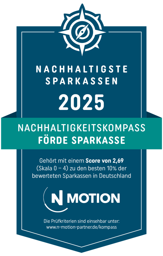 Alljährlich lässt die Förde Sparkasse ihre Nachhaltigkeitsleistungen von der Unternehmensberatung N-Motion überprüfen. N-Motion begleitet unser Haus seit 2015, ist auf die Beratung von Kreditinstituten in Nachhaltigkeitsthemen spezialisiert und unterstützt Finanzinstitute bei der Entwicklung ihrer individuellen Nachhaltigkeitsstrategie.